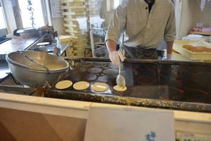 どら焼きは店頭で実演販売しています。いくつもの皮をすばやく同じ大きさで焼くテクニックは、見ていてため息が出ますよ。
